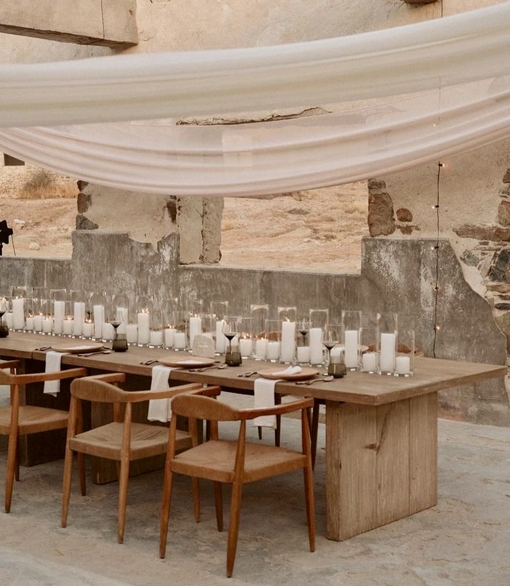Long, winding “S” shaped tables that snake through gardens or dining halls. This promotes a more fluid conversation style and breaks the “banquet hall” feel.